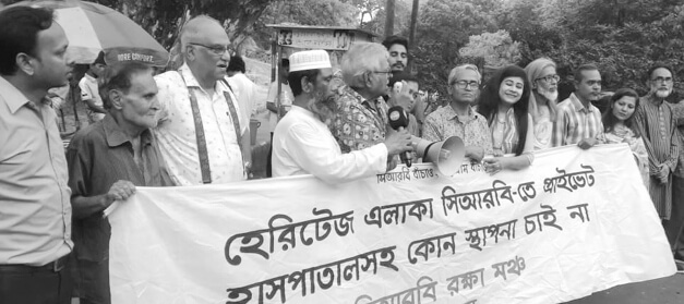 সিআরবি রক্ষা মঞ্চের উদ্যোগে গতকাল মঙ্গলবার প্রতিবাদ সমাবেশ অনুষ্ঠিত হয়। এতে সভাপতিত্ব করেন বীর মুক্তিযোদ্ধা ডা. মাহফুজুর রহমান। উপস্থাপক, লেখক দিলরুবা খানম ছুটির সঞ্চালনায় সিআরবির সাত রাস্তার মোড়ে সমাবেশে প্রধান বক্তা ছিলেন ডা. ইমরান বিন ইউনুস। বক্তব্য দেন, বীর মুক্তিযোদ্ধা সুজাউদ্দৌলা, রাজা মিয়া, ডা. আরমান যাইদ, সংগঠনের সাধারণ সম্পাদক রিজুয়ানুর রহমান খান, সঙ্গীতশিল্পী হাসান জাহাঙ্গীর, বনবিহারী চক্রবর্তী, মোর্শেদ আলম, সোহাইল উদ দোজা, সংগঠক চিরন্তন চিরু, মোরশেদুল আলম, রনি ইসলাম, তাহমিদুল ইসলাম, তামিম, শাহ আলম, জেসমিন সুলতানা, মেজবাহ চৌধুরী, সুলতানা আজমীরি, শাহদাত হোসেন, আনোয়ার জাহান, রৌজী, মীর সাকিব, শেখ মাহবুবুর রহমান বিভেল, রাজনীতিবিদ রিদুয়ান হৃদয়, এম এম কায়সার, শাহিদা আক্তার জোনাকি, রিপা মজুমদার, মোহাম্মদ হোসাইন, মাইশা, মিথিলা প্রমুখ।