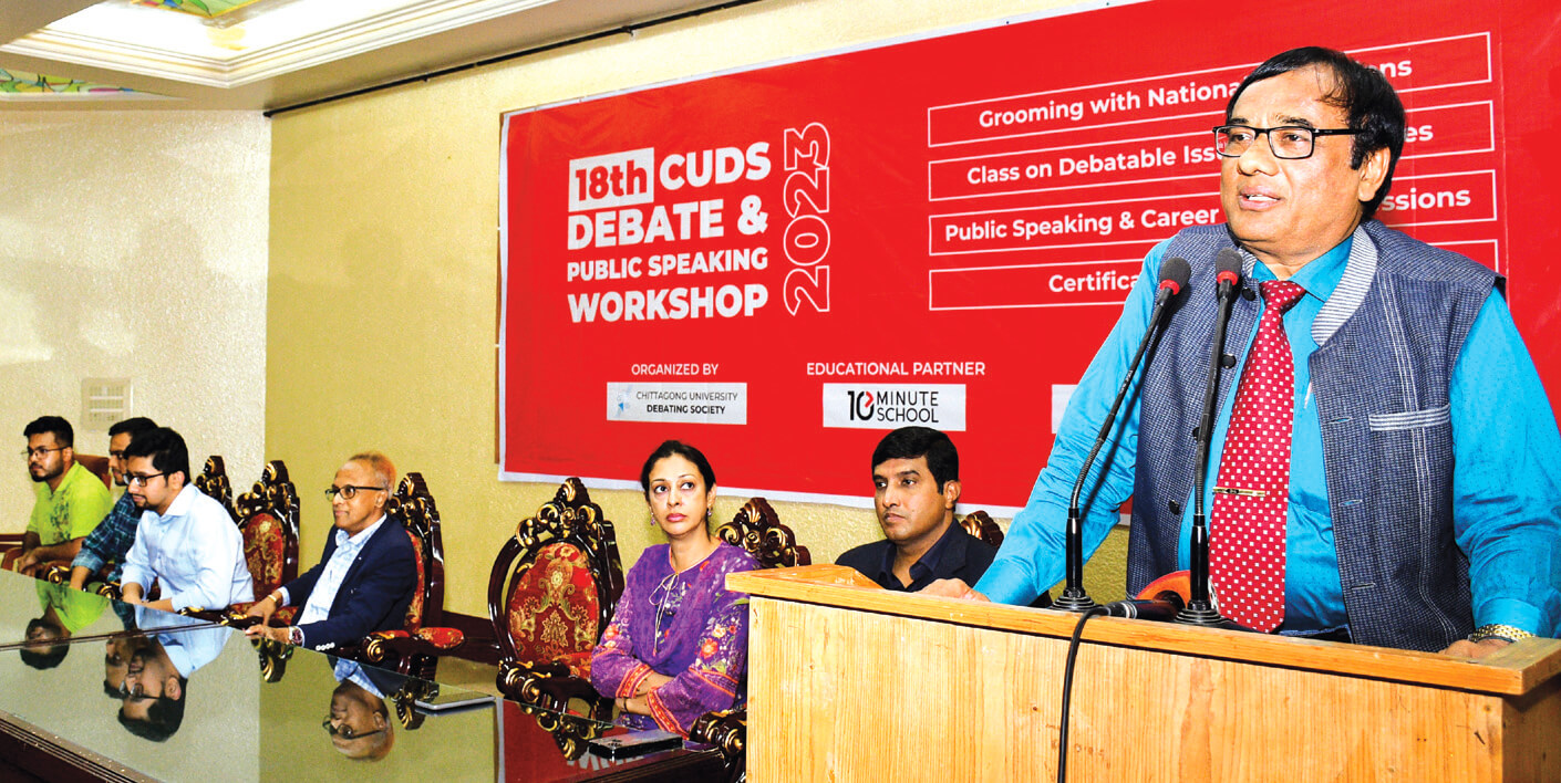 চট্টগ্রাম বিশ্ববিদ্যালয় ডিবেটিং সোসাইটির (সিইউডিএস) আয়োজনে ১৮তম সিইউডিএস ডিবেট এন্ড পাবলিক স্পিকিং ওয়ার্কশপ ব্যবসায় প্রশাসন অনুষদ মিলনায়তনে গতকাল বুধবার অনুষ্ঠিত হয়। এতে বিশেষ অতিথি ছিলেন উপ–উপাচার্য (একাডেমিক) প্রফেসর বেনু কুমার দে, ব্যবসায় প্রশাসন অনুষদের ডিন প্রফেসর মো. হেলাল উদ্দিন নিজামী ও সমাজ বিজ্ঞান অনুষদের ডিন প্রফেসর সিরাজ উদ দৌল্লাহ।