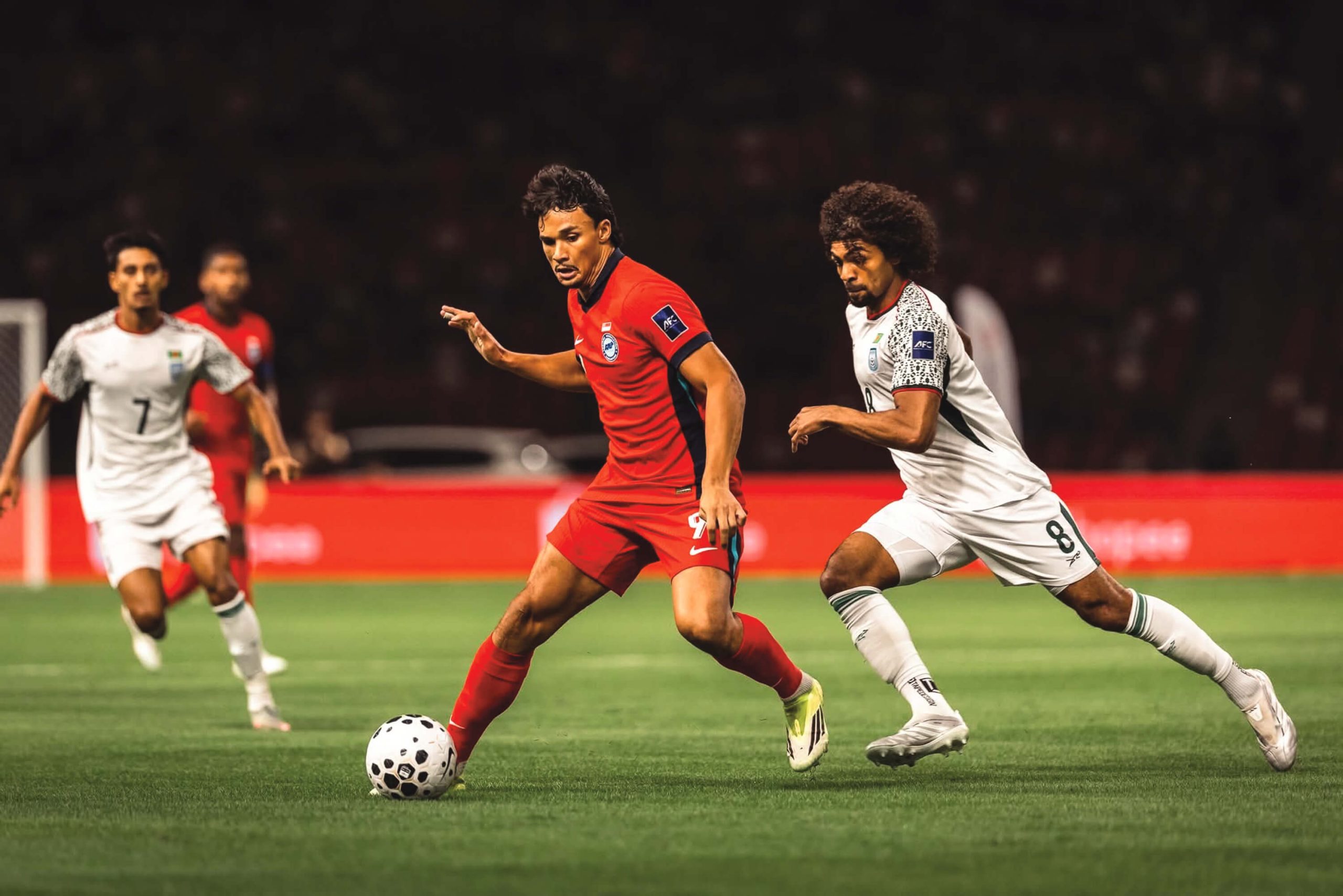 দুটি পরিবর্তন এনে সিঙ্গাপুর ম্যাচের একাদশ সাজান হেড কোচ কাবরেরা। প্রীতি ম্যাচে পোস্ট সামলানো মেহেদী হাসান শ্রাবণের জায়গায় ফিরেন নিয়মিত গোলকিপার মিতুল মারমা। আক্রমণভাগে মিরাজুল ইসলামের বদলে সুযোগ পান শেখ মোরসালিন। ভিয়েতনাম ম্যাচের মতো এ ম্যাচেও সেরা একাদশে ঠাঁই মেলেনি জামাল ভূঁইয়ার; বাকি সময়েও খেলার সুযোগ মেলেনি তার। শুরু থেকেই দুই দল প্রতিপক্ষের রক্ষণে চাপ দেওয়ার চেষ্টা করতে থাকে, কিন্তু গোলকিপারদের পরীক্ষা নিতে পারছিল না কেউ। সপ্তম মিনিটে মিনিটে ডান দিক থেকে ফাহামিদুলের বাড়ানো ক্রস ফয়সাল আহমেদ ফাহিমের কাছে পৌঁছানোর আগেই ক্লিয়ার করেন হ্যারিস স্টুয়ার্ট। পঞ্চদশ মিনিটে সাদউদ্দিনের ক্রসে শমিত সোম হেড করলেও পোস্টের অনেক বাইরে দিয়ে যায়। ২০তম মিনিটে ইখসান ফান্দির জোরাল শট বলের লাইনে থাকায় আটকান মিতুল।