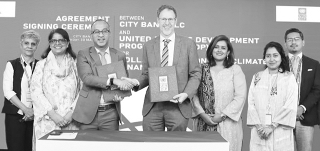 সিটি ব্যাংক পিএলসি ও জাতিসংঘ উন্নয়ন কর্মসূচি (ইউএনডিপি) একটি সমঝোতা স্মারক স্বাক্ষর করেছে। এর লক্ষ্য বাংলাদেশে জলবায়ুু অর্থায়ন ত্বরান্বিত করা এবং বিশেষভাবে দেশের উদীয়মান গ্রিন ও থিমভিত্তিক বন্ড বাজারের উন্নয়নে কৌশলগত গুরুত্ব প্রদান। ঢাকায় সিটি ব্যাংকের প্রধান কার্যালয়ে আয়োজিত এক অনুষ্ঠানে সমঝোতা স্মারকটি স্বাক্ষর করেন সিটি ব্যাংকের ব্যবস্থাপনা পরিচালক ও প্রধান নির্বাহী কর্মকর্তা মাসরুর আরেফিন এবং ইউএনডিপি বাংলাদেশের আবাসিক প্রতিনিধি স্টেফান লিলার।