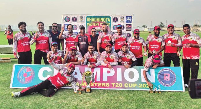 ঢাকায় অনুষ্ঠিত স্বাধীনতা মাস্টার্স টি–টোয়েন্টি ক্রিকেট টুর্নামেন্টে চ্যাম্পিয়ন হয়েছে চিটাগং মাস্টার্স। গত শনিবার অনুষ্ঠিত টুর্নামেন্টের ফাইনালে চিটাগং মাস্টার্স ৮৩ রানে লিজেন্ড ক্রিকেট ক্লাবকে পরাজিত করে শিরোপা জিতে নেয়। প্রথমে ব্যাট করতে নামা চিটাগং মাস্টার্স নির্ধারিত ২০ ওভারে ৩ উইকেটে ২৩৯ রানের বিশাল পাহাড় গড়ে। দলের পক্ষে একরামুল হক ৮০ রান করে অপরাজিত থাকেন। এছাড়া শাবিব ৬০, মোস্তফা রনি ৫৫ এবং রাজিব মোস্তফা ৩০ রান করেন। জবাবে ব্যাট করতে নামা লিজেন্ড ক্রিকেট ক্লাব নির্ধারিত ২০ ওভারে ১৫৬ রান করতে সক্ষম হয়। দলের পক্ষে ২৯ রান করেন চঞ্চল। এছাড়া সুমন ১৭, সাগর ১৫, রাশেদ ১৮, সজল ১৩, রিগ্যান ১৬ এবং মিজান করেন ১২ রান। চিটাগং মাস্টার্সের পক্ষে রায়হান আরাফাত পান ৩ উইকেট। এছাড়া মোস্তফা রনি এবং নঈম উদ্দিন নেন ২টি করে উইকেট।