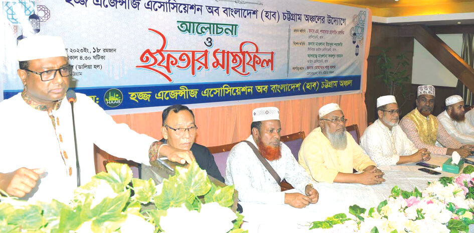 হজ্ব এজেন্সিজ এসোসিয়েশন অব বাংলাদেশ (হাব) চট্টগ্রাম অঞ্চল আয়োজিত ইফতার ও দোয়া মাহফিল গত সোমবার নগরীর একটি হোটেলে অনুষ্ঠিত হয়। হাব চট্টগ্রাম অঞ্চলের সভাপতি মোহাম্মদ শাহ আলমের সভাপতিত্বে এবং সেক্রেটারি মোহাম্মদ আব্দুল মালেকের সঞ্চালনায় মাহফিলে প্রধান অতিথি ছিলেন হাব এর কেন্দ্রীয় চেয়ারম্যান এম শাহাদাত হোসাইন তসলিম।