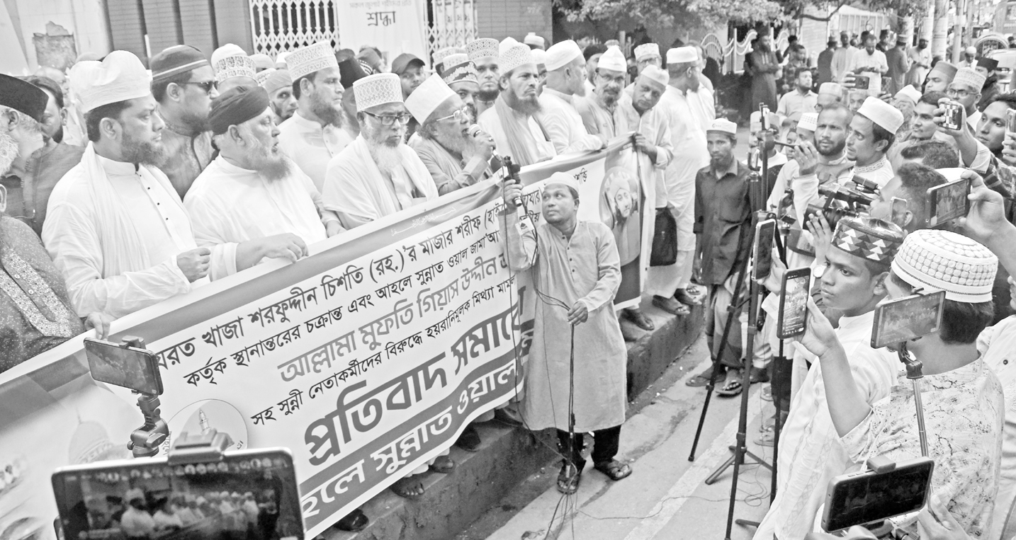 পবিত্র ইসলাম প্রচারক হযরত খাজা শরফুদ্দীন চিশতি (রহ.)’র মাজার শরীফ (হাইকোর্ট মাজার) উগ্রবাদী অপশক্তি কর্তৃক স্থানান্তরের চক্রান্তের প্রতিবাদে ও আহলে সুন্নাত ওয়াল জামাআ’তের কেন্দ্রীয় সাংগঠনিক সচিব মুফতি গিয়াস উদ্দীন আত–তাহেরীসহ সুন্নী নেতাকর্মীদের বিরুদ্ধে হয়রানিমূলক মামলা প্রত্যাহারের দাবিতে গতকাল বুধবার চট্টগ্রাম প্রেসক্লাব চত্বরে প্রতিবাদ সমাবেশ অনুষ্ঠিত হয়। এতে প্রধান অতিথি ছিলেন আহলে সুন্নাত ওয়াল জমা’আতের চেয়ারম্যান শায়খুল হাদিস কাজী মঈনুদ্দীন আশরাফী। প্রধান বক্তা ছিলেন নির্বাহী চেয়ারম্যান আবুল কাশেম নূরী। মাওলানা শাহ নুর মোহাম্মদ আলকাদেরীর সভাপতিত্বে ও মাওলানা আব্দুন নবী আলকাদেরীর পরিচালনায় বিশেষ অতিথি ছিলেন, অধ্যক্ষ আল্লামা স উ ম আবদুস সামাদ, অধ্যক্ষ আল্লামা আবুল ফরাহ মুহাম্মদ ফরিদ উদ্দিন, শায়খুল হাদিস জয়নাল আবেদীন জুবাইর, অধ্যক্ষ এস এম ফরিদ উদ্দিন, এম সোলায়মান ফরিদ। প্রধান অতিথি আল্লামা আশরাফী বলেন, আউলিয়া–কেরামের বিরুদ্ধে উগ্রবাদী শক্তি দেশে এক প্রকার যুদ্ধ ঘোষণা করেছে। ৫ আগস্টের পট পরিবর্তনের পর দেশব্যাপী পীর–আউলিয়ার মাজারে উগ্রবাদীদের ঘৃণ্য হামলা দেশের সংখ্যাগরিষ্ঠ সুফীবাদি সুন্নী মুসলমানদের চরমভাবে আশাহত করেছে। আহলে সুন্নাত কখনও তা মেনে নেবে না। তাই হাইকোর্ট মাজার সরানোর ষড়যন্ত্র সুন্নী জনতাকে সাথে নিয়ে প্রতিহত করব। মুফতি গিয়াস উদ্দিন তাহেরীসহ সুন্নী নেতৃবৃন্দের বিরুদ্ধে ষড়যন্ত্রমূলক মামলা দায়েরের নিন্দা জানান তিনি।