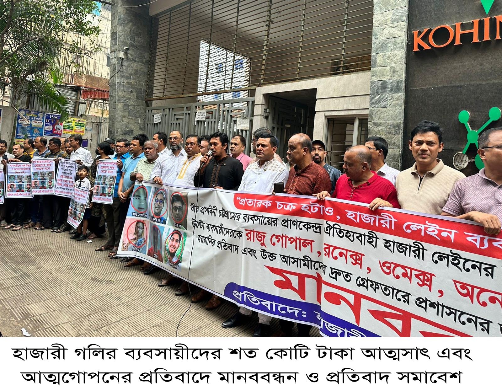 হাজারী লেইনের অসংখ্য ব্যবসায়ীর শত কোটি টাকা নিয়ে আত্মগোপনকারীদের গ্রেফতার ও দ্রুত বিচারের দাবিতে হাজারী লেইনের সর্বস্তরের স্বর্ণ সহ সকল ব্যবসায়ীরা মানববন্ধন ও প্রতিবাদ সমাবেশ করেছে।