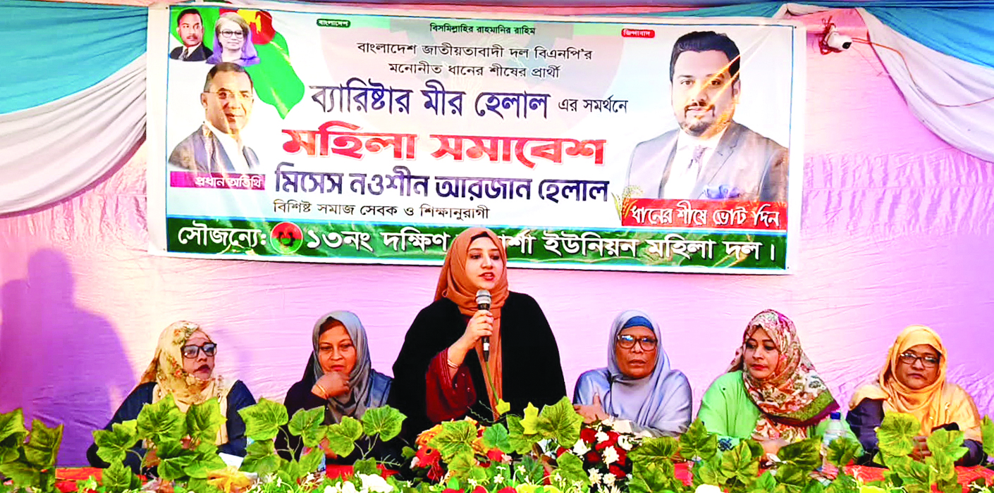 চট্টগ্রাম–৫ হাটহাজারী বায়েজিদ আসনে বিএনপির মনোনীত ধানের শীষের প্রার্থী ও বিএনপির কেন্দ্রীয় সহ–সাংগঠনিক সম্পাদক ব্যারিস্টার মীর মোহাম্মদ হেলাল উদ্দিনের সমর্থনে দক্ষিণ মাদার্শা ইউনিয়ন মহিলা দলের উদ্যোগে এক সমাবেশ অনুষ্ঠিত হয়। মহিলা দলের সভাপতি নাছরীন আকতারের সভাপতিত্বে অনুষ্ঠিত সমাবেশে প্রধান অতিথি হিসেবে বক্তব্য রাখেন ধানের শীষের প্রার্থী ব্যারিস্টার মীর মোহাম্মদ হেলাল উদ্দিনের সহধর্মিণী বিশিষ্ট সমাজসেবী ও শিক্ষানুরাগী নওশিন আরজান হেলাল। প্রধান অতিথির বক্তব্যে নওশিন বলেন, বাংলাদেশের নারী সমাজের উন্নয়নে ও নারীর ক্ষমতায়নে দেশনেত্রী বেগম খালেদা জিয়ার অবদান সারা বিশ্বে সমাদৃত। মেয়েদের অবৈতনিক শিক্ষা, কারিগরি শিক্ষা, ক্ষুদ্র ও কুটির শিল্পের উন্নয়ন, শহীদ জিয়ার প্রবর্তিত তৈরি পোশাক খাতের সমপ্রসারণ, আইনশৃঙ্খলা বাহিনী, সামরিক ও বেসামরিক বাহিনীতে নারী নিয়োগ সরকারি বেসরকারি খাতে নারীর কর্মসংস্থান, নারী উদ্যোক্তা তৈরীসহ নারীর ক্ষমতায়নে বেগম খালেদা জিয়ার সরকার তথা বিএনপি সরকারের অভূতপূর্ব সাফল্য তুলে ধরে নওশিন বলেন, নারীদের প্রকৃত উন্নয়ন ও মর্যাদা নিশ্চিত করতে এবার বিএনপিকে বিজয়ী করতে হবে। দীর্ঘদিন পর আমাদের মা বোনেরা এবার নির্ভয়ে ভোট দিতে পারবে বলে উল্লেখ করে নওশিন আগামী ফেব্রুয়ারির নির্বাচনে মা বোনদেরকে মিলেমিশে মীর হেলালকে ধানের শীষ মার্কায় ভোট দেওয়ার আহ্বান জানান। ধানের শীষের প্রার্থী মীর হেলাল বিজয়ী হলে হাটহাজারীর প্রতিটি গ্রামের সমস্যা বিশেষত নারী সমাজের সমস্যা চিহ্নিত করে অগ্রাধিকার ভিত্তিতে সমাধান করা হবে বলে উল্লেখ করে মিসেস হেলাল বলেন হাটহাজারী হবে নারী সমাজের নিরাপদ আাবাসস্থল। এর আগে তিনি এলাকায় গণসংযোগ করেন এবং ধানের শীষের প্রার্থী মীর হেলালের পক্ষে ভোট ও দোয়া কামনা করেন। সমাবেশে শুভেচ্ছা বক্তব্য রাখেন বিএনপি মনোনীত ধানের শীষের প্রার্থী ব্যারিস্টার মীর মোহাম্মদ হেলাল উদ্দিন। হাটহাজারী উপজেলা মহিলা দলের সভাপতি নাছরিন আকতারের সভাপতিত্বে অনুষ্ঠিত সমাবেশে অন্যান্যের মধ্যে উপজেলা মহিলা দলের সাধারণ সম্পাদিকা মালা বেগম, সেলিনা আক্তার, রহিমা আক্তার, রেহেনা আক্তার রানু, রাশেদা বেগম, ডলি আকতার, দিলু আরা বেগম, আকতার বানু, হোসনে আরা, জান্নাতুল ফেরদৌস, নিলুফার ইয়াছমিন, তাসনিম আক্তার, তানজু আক্তার, রোকসানা, আয়েশা সুলতানা, সুমা আক্তার, হাসিনা বেগম, সুমী বড়ুয়া, সোমা শীল নেতৃবৃন্দ উপস্থিত ছিলেন। প্রেস বিজ্ঞপ্তি।