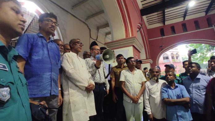 বিক্ষোভ সমাবেশে বক্তারা অভিযোগ করেন, রেল কর্তৃপক্ষ বেসরকারি কোম্পানির সঙ্গে চুক্তি করতে গিয়ে শতবর্ষী কবরস্থান, ধর্মীয় স্থাপনা ও জলাশয়ের জমির শ্রেণি পরিবর্তন করে জালিয়াতি করেছে। কবরস্থানটিতে প্রায় ৪৫০টি কবর রয়েছে। সব জেনেও ধর্মীয় প্রতিষ্ঠানটিকে ঘিরে লিজ দেওয়া হয়েছে। তারা বলেন, রেলওয়ের ইতিহাসে কখনো ধর্মীয় স্থাপনা ও কবরস্থান দখল করে প্রকল্প নেওয়া হয়নি, এবার রেলওয়ের ভূ–সম্পত্তি বিভাগ নিজেই আইন ভঙ্গ করছে। বিক্ষোভকারী রেল শ্রমিকরা বলেন, আন্দোলনের মধ্যেই কৌশলে মসজিদ–মাজার ও কবরস্থান উচ্ছেদের চক্রান্ত চলছে। রেল সচিব ও উপদেষ্টার মৌখিক নির্দেশনা থাকা সত্ত্বেও এখনো ধর্মীয় প্রতিষ্ঠান সংরক্ষণের লিখিত আদেশ আসেনি যা প্রতারণার শামিল। যৌক্তিক দাবি আদায় না হলে সারাদেশে রেল ধর্মঘটের ডাক দেওয়া হবে। তবুও কবরস্থান–মসজিদ বিক্রি করতে দেওয়া হবে না।