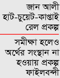 অর্থের সংস্থান না হওয়ায় ১০ বছরেও আলোর মুখ দেখেনি জান আলী হাট থেকে চুয়েট (চট্টগ্রাম প্রকৌশল বিশ্ববিদ্যালয়) হয়ে কাপ্তাই পর্যন্ত ৪২ কিলোমিটার রেল লাইন নির্মাণ প্রকল্পটি। চট্টগ্রাম থেকে রাউজানরাঙ্গুনিয়া হয়ে ট্রেন যাবে অপরূপ সৌন্দর্যে ঘেরা কাপ্তাইয়ে। রেলওয়ের এই প্রকল্পে ব্যাপক আশা জাগিয়েছিল এই অঞ্চলের মানুষের মধ্যে। এই প্রকল্পের কথা শোনা যাচ্ছিল আজ থেকে ১০ বছর আগে থেকে। সমীক্ষা শুরু হওয়ায় এই অঞ্চলের মানুষের মধ্যে প্রকল্পটি আশার আলোর সঞ্চার করেছিল। শেষ পর্যন্ত সমীক্ষাও শেষ হয়েছিল। কিন্তু প্রকল্প বাস্তবায়নের কোনো উদ্যোগ দেখা যাচ্ছে না। চট্টগ্রামের অত্যন্ত গুরুত্বপূর্ণ এই প্রকল্পটি গত ১০ বছর ধরে ফাইলবন্দী হয়ে আছে। প্রকল্পটির ব্যাপারে রেল কর্তৃপক্ষের তেমন কোনো আগ্রহই দেখা যাচ্ছে না। অর্থের সংস্থান না হওয়ায় প্রকল্পের কাজ বারবার পিছিয়ে যাচ্ছে।
