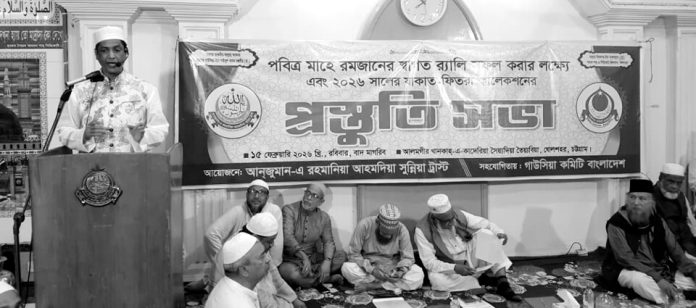 কাল মঙ্গলবার মাহে রমজানের স্বাগত র্যালি সফলকল্পে এবং ২০২৬ সালের যাকাত–ফিতরা কালেকশনের জন্য এক প্রস্তুতি সভা গতকাল রবিবার বা’দ মাগরিব আলমগীর খানকা–এ কাদেরিয়া সৈয়্যদিয়া তৈয়্যবিয়ায় অনুষ্ঠিত হয়। এতে সভাপতিত্ব করেন আনজুমান ট্রাস্টের সিনিয়র ভাইস প্রেসিডেন্ট মোহাম্মদ মনজুর আলম (মনজু)। প্রধান বক্তা ছিলেন সেক্রেটারি জেনারেল মোহাম্মদ আনোয়ার হোসেন। অন্যান্যদের মধ্যে উপস্থিত ছিলেন ট্রাস্টের অ্যাডিশনাল সেক্রেটারি মোহাম্মদ সামশুদ্দীন, ফাইন্যান্স সেক্রেটারি মোহাম্মদ কমর উদ্দীন (সবুর), প্রেস এন্ড পাবলিকেশন সেক্রেটারি মোহাম্মদ গোলাম মহিউদ্দীন, ক্যাবিনেট মেম্বার পেয়ার মোহাম্মদ, মোহাম্মদ হোসেন খোকন, আনজুমান সদস্য নূর মোহাম্মদ কন্ট্রাক্টর, আবদুল হাই মাসুম, মাহবুবুল আলম, মুফতি সৈয়দ মুহাম্মদ অছিয়র রহমান, ড. সাইফুল আলম, মাহমুদ নেওয়াজ, মুহাম্মদ ইলিয়াছ, গাউসিয়া কমিটি বাংলাদেশের বিভিন্ন স্তরের সদস্যবৃন্দ। সঞ্চালনা করেন মুখপাত্র এড. মোছাহেব উদ্দীন বখতিয়ার।