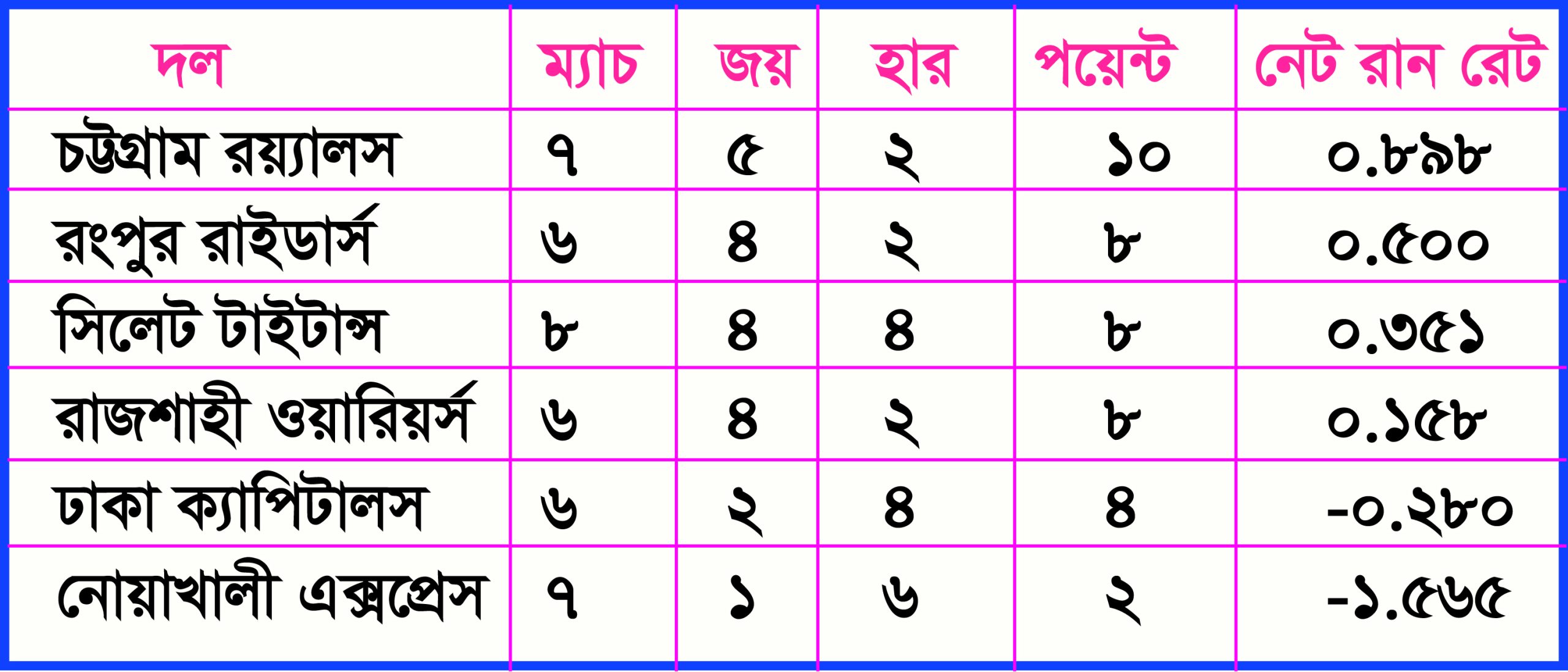 রংপুর রাইডার্স, রাজশাহী ওয়ারিয়র্স ও ঢাকা ক্যাপিটালসের খেলা হয়েছে ছয়টি করে ম্যাচ। সিলেট টাইটান্সকে আগের ম্যাচে হারিয়ে শীর্ষে উঠেছিল চট্টগ্রাম। গত শুক্রবার রাজশাহী ওয়ারিয়র্সের বিপক্ষে নাটকীয় জয়ে সেই অবস্থান আরও সুসংহত করল তারা। আর নোয়াখালীর প্রথম শিকার হয়ে রংপুর তাদের চেয়ে দুই পয়েন্ট পেছনে পড়েছে।