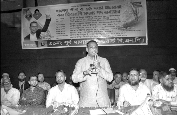মহানগর বিএনপির ৩০নং ওয়ার্ডের উদ্যোগে ধানের শীষের পক্ষে প্রচারণা, বিএনপি ঘোষিত ৩১ দফা কর্মসূচি প্রচার এবং সদস্য পদ নবায়ন কর্মসূচির উদ্বোধন করা হয়। এতে সভাপতিত্ব করেন ওয়ার্ড বিএনপির আহবায়ক আজিজুল ইসলাম বাদল এবং সঞ্চালনা করেন সদস্য সচিব সৈয়দ তসলিমুর রহমান। প্রধান অতিথি ছিলেন মহানগর বিএনপির সদস্য সচিব নাজিমুর রহমান। তিনি বলেন, বাংলাদেশ একটি নতুন সম্ভাবনার দ্বারপ্রান্তে দাঁড়িয়ে আছে। আমরা দৃঢ়ভাবে বিশ্বাস করি, আগামী ফেব্রুয়ারিতে অনুষ্ঠিত নির্বাচন দেশের গণতান্ত্রিক ধারাকে আরো সুদৃঢ় করবে এবং জনগণের অংশগ্রহণমূলক রাষ্ট্রগঠনের পথকে দৃঢ় করবে। বিএনপি সবসময় স্বচ্ছ ও সুষ্ঠু নির্বাচনের পক্ষে কাজ করেছে এবং ভবিষ্যতেও এ পথ অব্যাহত রাখবে। প্রধান বক্তা হিসেবে বক্তব্য রাখেন বিএনপির আন্তর্জাতিক বিষয়ক উপ–কমিটির সদস্য ইসরাফিল খসরু মাহমুদ চৌধুরী। তিনি বলেন, বাংলাদেশ এখন নতুন সম্ভাবনা ও উজ্জ্বল সময়ের দিকে এগোচ্ছে। আগামী ফেব্রুয়ারি অনুষ্ঠিত নির্বাচন দেশের গণতান্ত্রিক ধারাকে আরও শক্তিশালী করবে এবং জনগণের আস্থা ও প্রত্যাশাকে নতুন মাত্রা দেবে। বিশেষ অতিথি ছিলেন মহানগর বিএনপির সদস্য মশিউল আলম স্বপন, কাউছার হোসেন বাবু, খোরশেদ আলম খুরশিদ। উপস্থিত ছিলেন হাজী আমির আহাম্মদ, হাজী আলী আহাম্মদ, সিরাজ মিয়া মানু, মো. নাছির, জাহেদ, রিদুয়ান, মো. ফারুক, সেলিম, রনি, মো. শাহজাহান, কমল জ্যোতি,আবু তালিব লিটন, মোহাম্মদ নাজিম উদ্দীন, আলী, সুমন, শাহেদ, আব্দুল আহাদ, সালমান প্রমুখ। প্রেস বিজ্ঞপ্তি।
