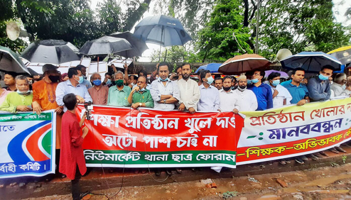 আগামী ৩০ জুনের মধ্যে শিক্ষাপ্রতিষ্ঠান খুলে দেওয়ার সময় বেঁধে দিয়ে জুলাইয়ের শুরুতে প্রধানমন্ত্রীর কার্যালয় অভিমুখে পদযাত্রা কর্মসূচির হুঁশিয়ারি দেওয়া হয়েছে। গতকাল শনিবার দুপুরে জাতীয় প্রেসক্লাবের সামনে ‘শিক্ষক-কর্মচারী-অবিভাবক ফোরামের’ ব্যানারে আয়োজিত মানববন্ধনে এ হুঁশিয়ারি দেন বক্তারা। খবর বিডিনিউজের।