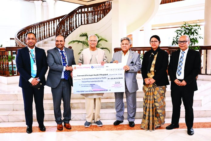 নৌপরিবহন মন্ত্রণালয়ের আওতাধীন বাংলাদেশ শিপিং কর্পোরেশনের (বিএসসি) ছয়টি জাহাজ কেনার জন্য নেওয়া ঋণ পরিশোধ এবং ২০২৪–২৫ অর্থবছরে ঘোষিত লভ্যাংশ বাবদ সরকারের পাওনা হিসেবে ২০৩ কোটি ৪৭ লাখ টাকার চেক হস্তান্তর অনুষ্ঠানে প্রধান উপদেষ্টার হাতে তুলে দেওয়া হয়। পরে প্রধান উপদেষ্টার দপ্তরের এক বিজ্ঞপ্তিতে অনুষ্ঠানের বিষয়ে জানানো হয়। নৌপরিবহন মন্ত্রণালয় এবং বিএসসি কর্মকর্তাদের উদ্দেশে প্রধান উপদেষ্টা বলেন, ভবিষ্যতে এমনভাবে পরিকল্পনা করতে হবে, যাতে এই প্রতিষ্ঠানের আয় দিয়ে প্রতিষ্ঠানই আরও শক্তিশালী হয়, বহরে নতুন নতুন জাহাজ যুক্ত হয়।