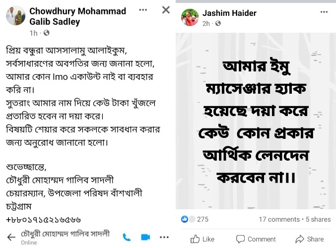 অপরদিকে, খানখানাবাদ ইউনিয়ন পরিষদের চেয়ারম্যান জসীম উদ্দিন হায়দার সামাজিক যোগাযোগ মাধ্যমে বলেন, সর্বসাধারণের অবগতির জন্য জানানো যাচ্ছে যে আমার ইমো আইডি হ্যাকড হয়েছে। উক্ত আইডি থেকে কোনো ধরনের আর্থিক লেনদেন বা কোনো অনাকাঙ্কিত দাবি করলে সকলকে সতর্ক থাকার জন্য অনুরোধ করা গেল।