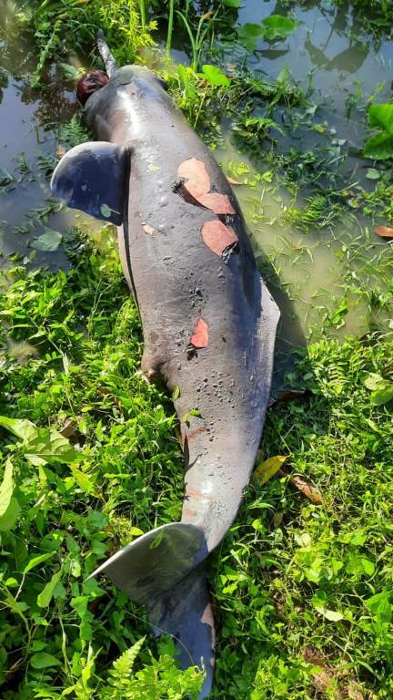 বঙ্গবন্ধু মৎস্য হেরিটেজ হালদা নদীতে আগে এত বড় ডলফিন দেখা যায়নি। ডলফিনটির শরীরে পচন ধরেছে তাই মৃত্যুর কারণ জানা সম্ভব হয়নি। এটি হালদা নদী থেকে উদ্ধার করা ৩৬তম মৃত ডলফিন।
